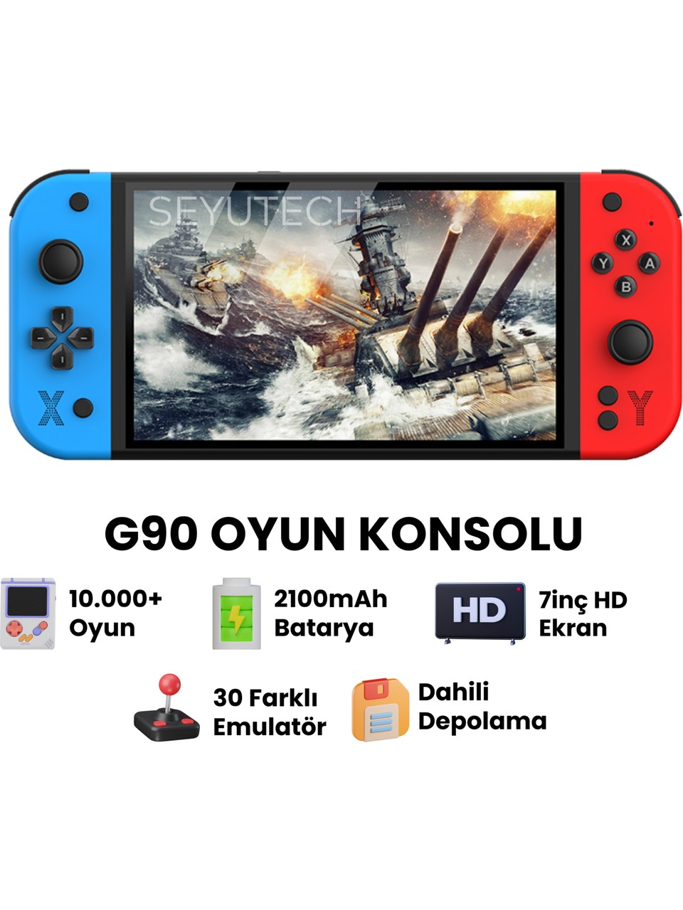 - Yüksek performanslı G90 oyun konsolu, 2000mAh bataryası ile uzun süreli oyun deneyimi sunar. - Geniş bir oyun yelpazesiyle donatılmış olan bu el atarisi, 10.000'den fazla farklı oyun seçeneğiyle eğlenceyi zirveye taşır. - 7 inç HD ekranı sayesinde net ve canlı görüntülerle oyunları daha gerçekçi bir şekilde yaşayabilirsiniz. - Çeşitli renk seçenekleri arasında yer alan kırmızı-mavi tasarımıyla dikkat çeken bu cihaz, şık görünümüyle de ön plana çıkar. - Kablolu bağlantı özelliği sayesinde kesintisiz ve hızlı bir oyun deneyimi sağlar; Bluetooth bağlantısına ihtiyaç duymadan rahatlıkla kullanabilirsiniz. - Ürünün ithalatçı garantisi altında olması, satın alma sonrasında da güven içinde kullanım imkanı tanır. - CE uyumluluk sembolüne sahip olup uluslararası standartlara uygun olarak üretilmiştir.
